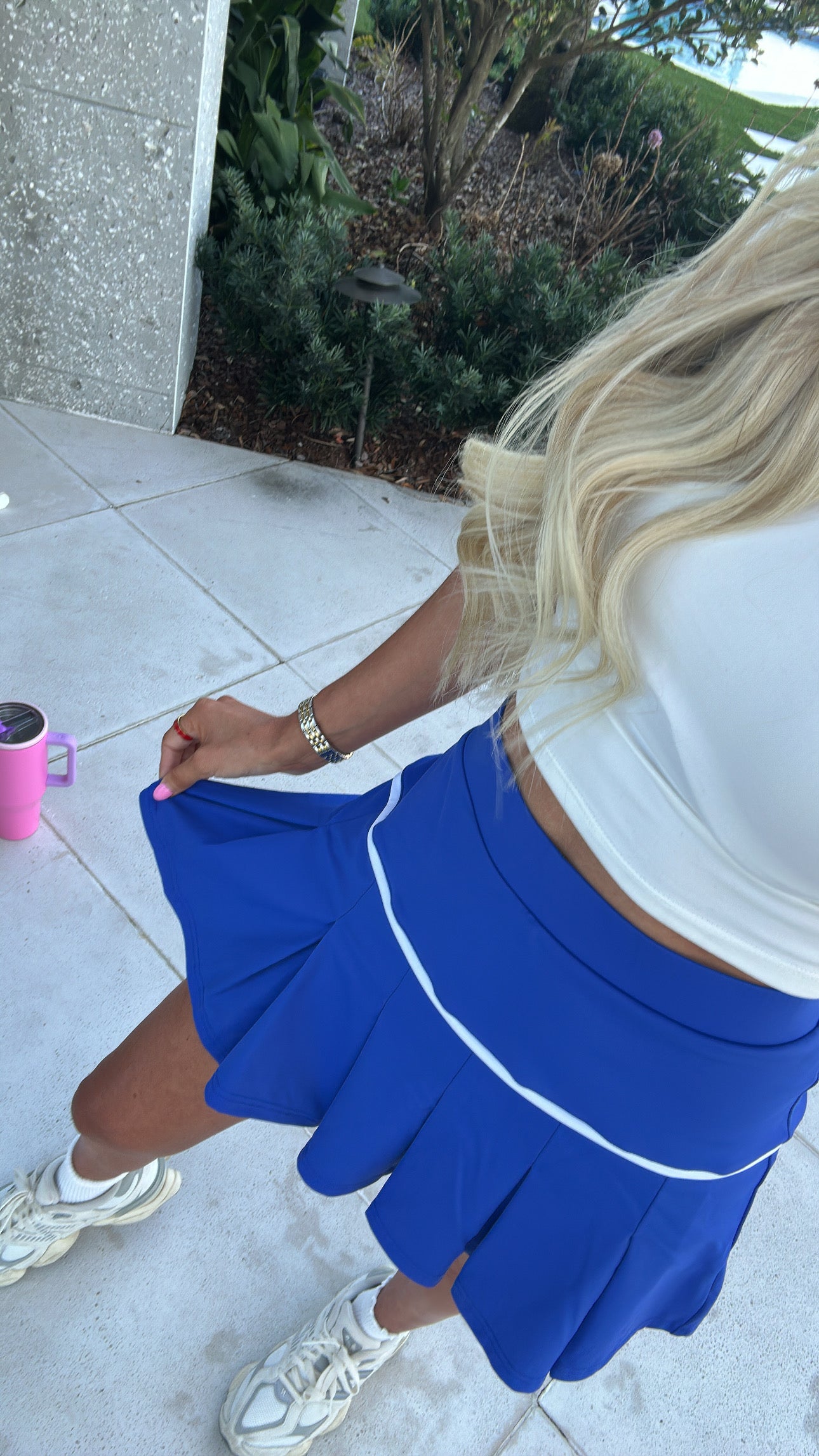 Introducing our Pia Pleated Skirt in royal blue. This fun little number is so perfect for running errands, hitting the golf course, pickleball and more! It features shorts underneath for an on the go feel!