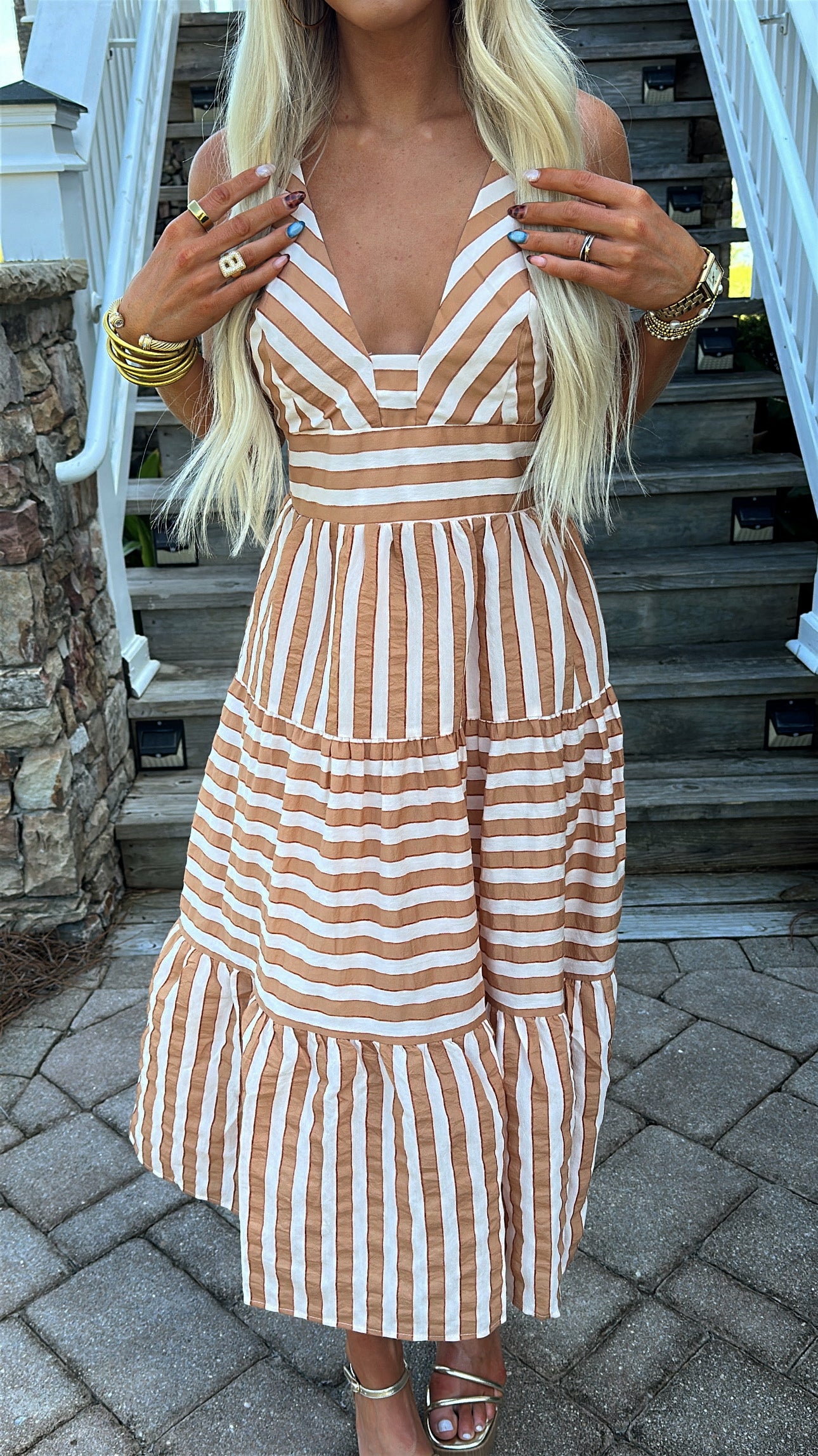Channeling you with effortless chic & bold stripes, we introduce you to our Campbell Midi Dress! The striped design gives a playful yet sophisticated vibe, while the flowing, relaxed silhouette allows for free movement and comfort. Featuring a flattering midi length, this dress is perfect for a fall transition staple!