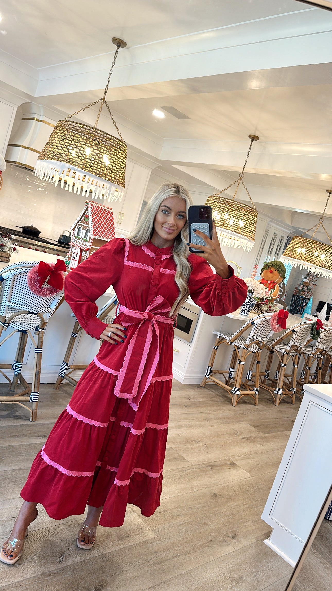 Introducing our Melania Midi Dress in Red! This dress features a beautiful ruffle, tiered design with a collared neckline and button down closure. The waist tie bow, detailing adds a touch of sophistication and feminine appeal.