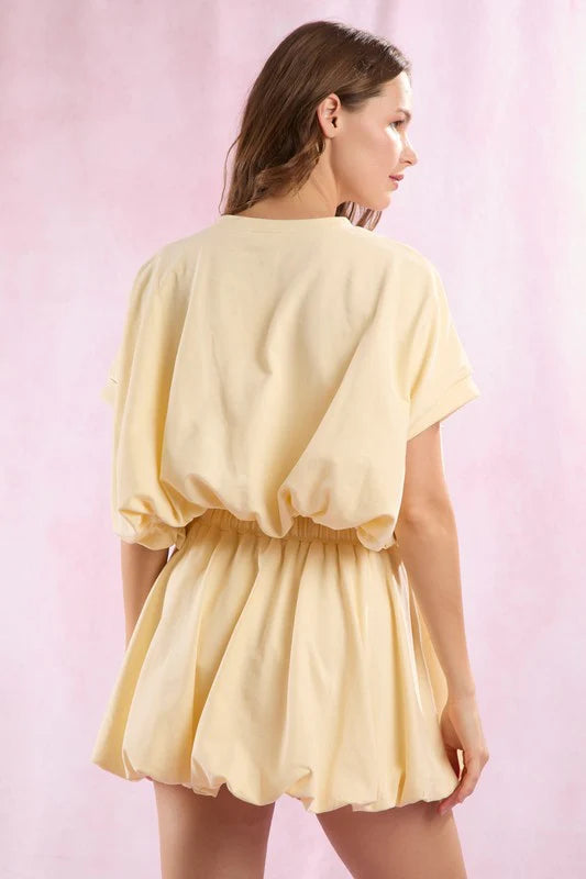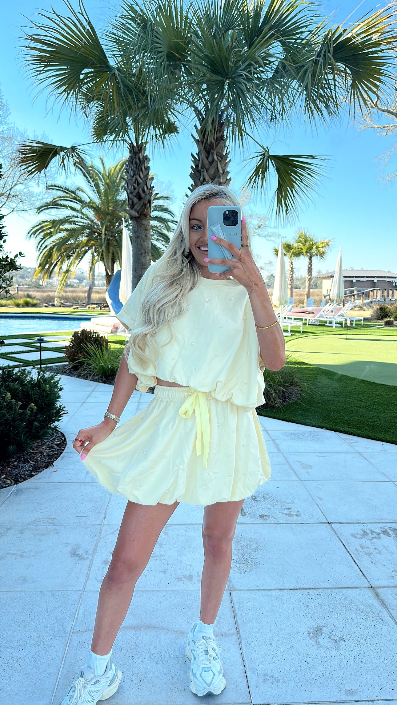 Introducing our pearl skort set in pale yellow. This set features a bubble hem skirt and boxy, short sleeve top with pearl details. The draw sting waist band makes this set easily adjustable for all sizes!