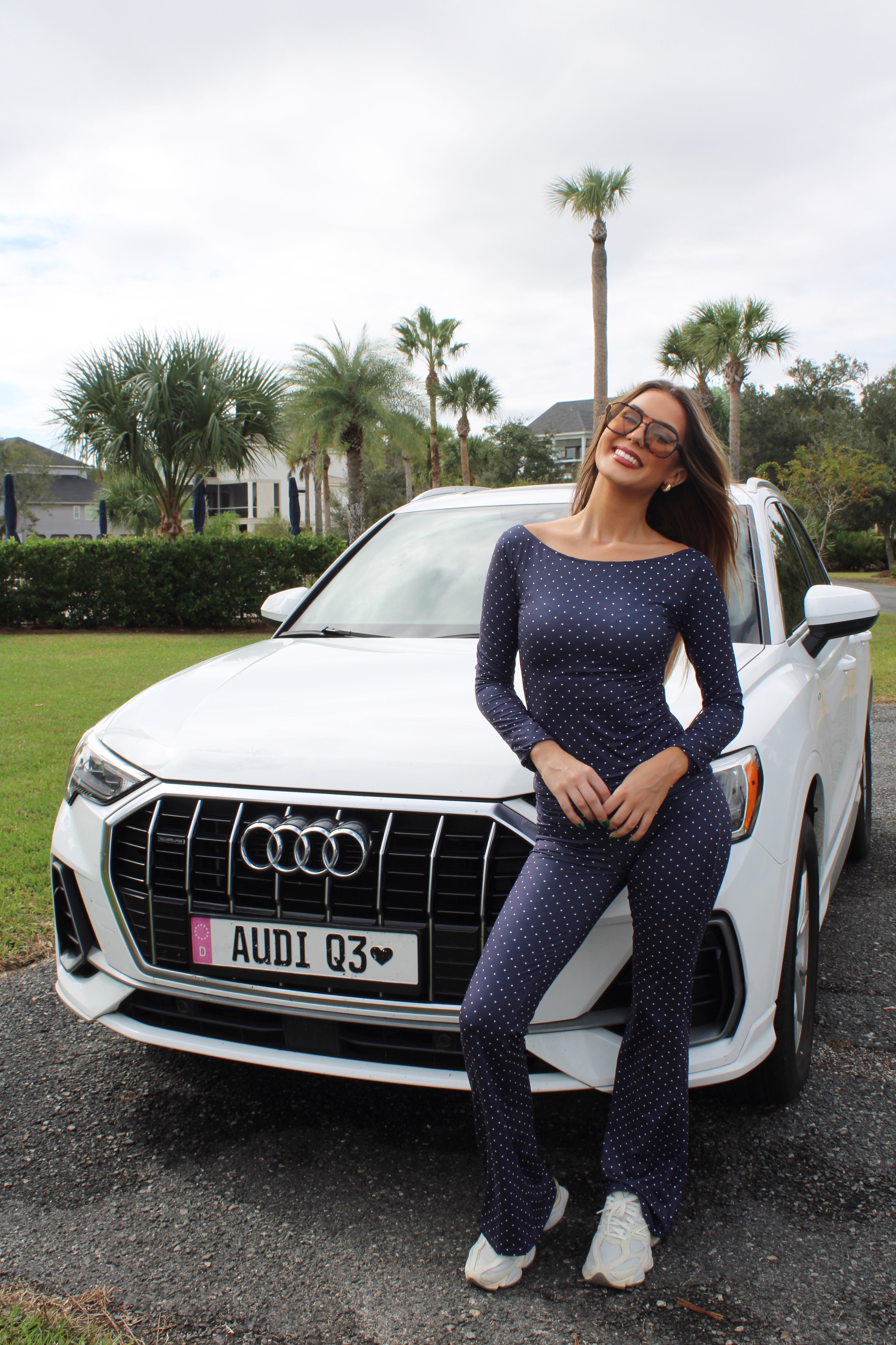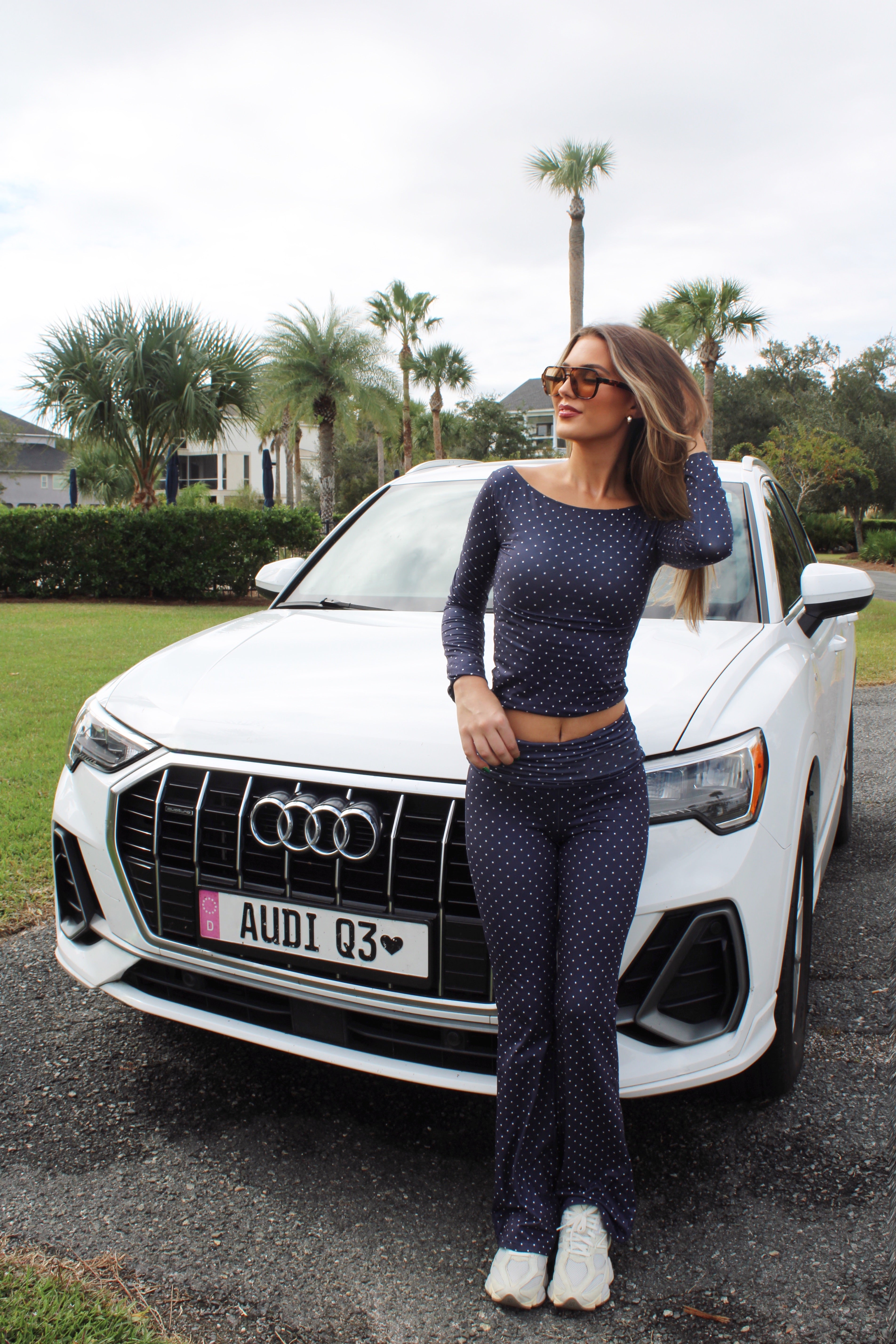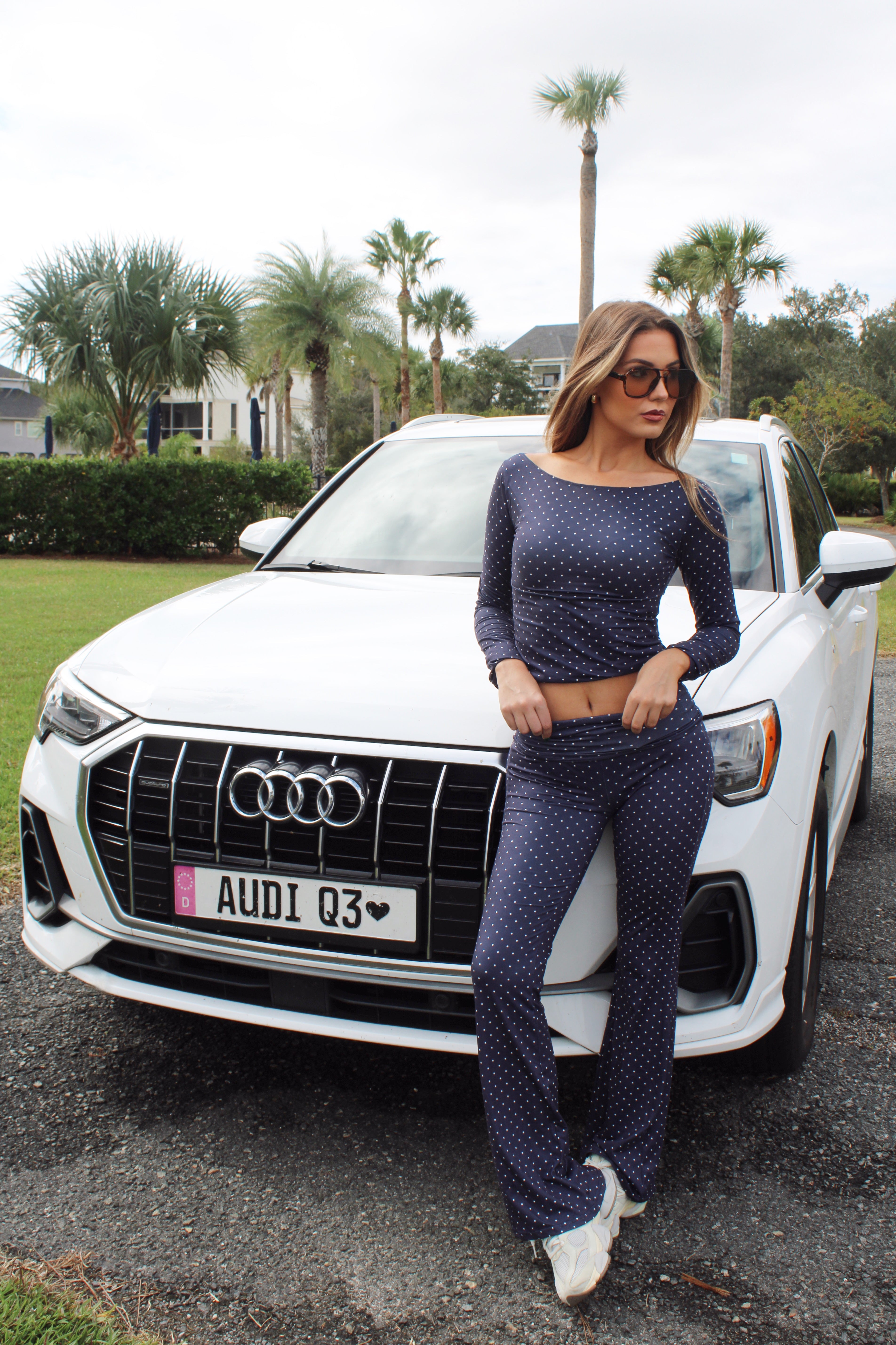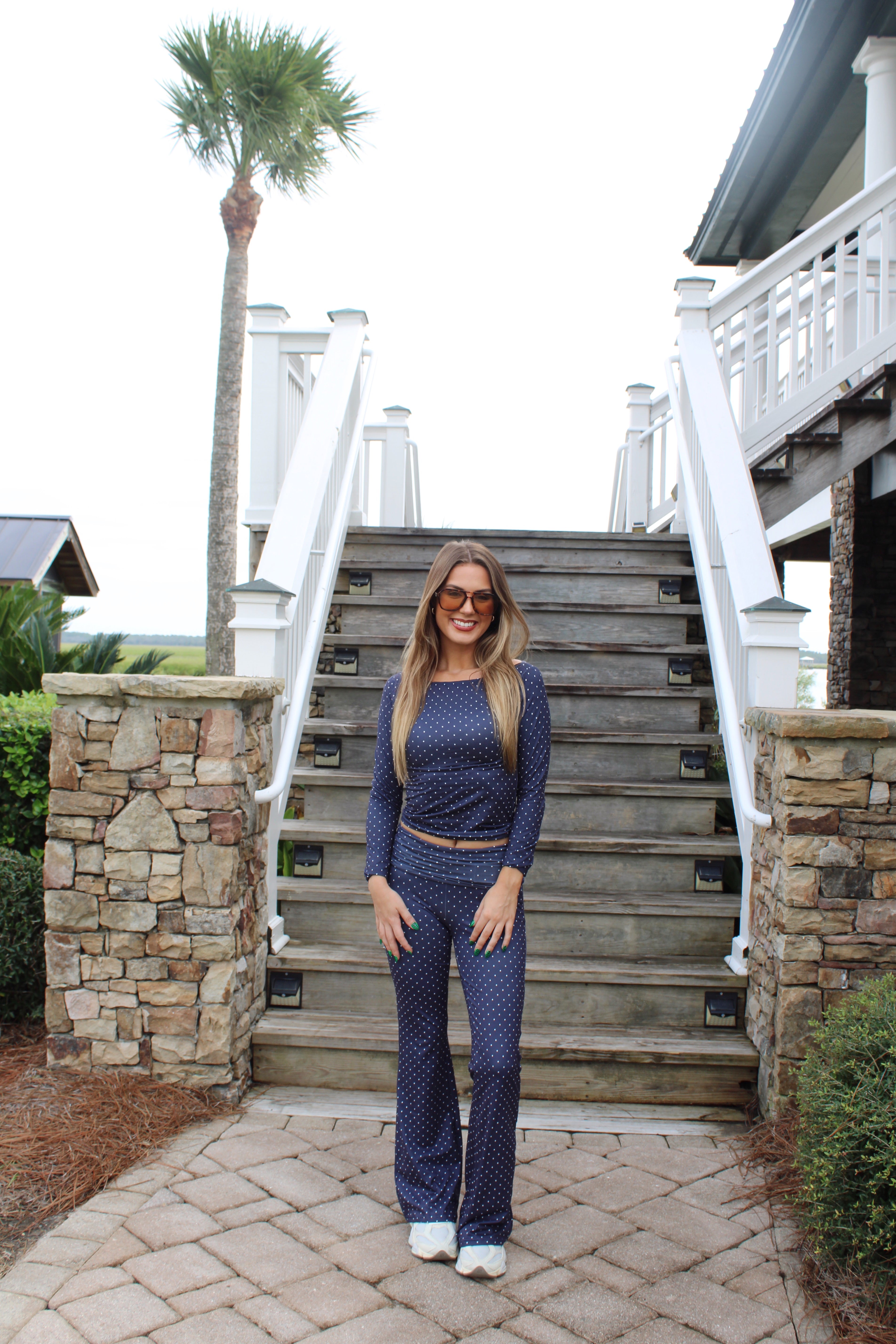 Introducing our polka dot foldover flare set in moody navy! This set features an off the shoulder, long sleeve top with flattering flare pants!